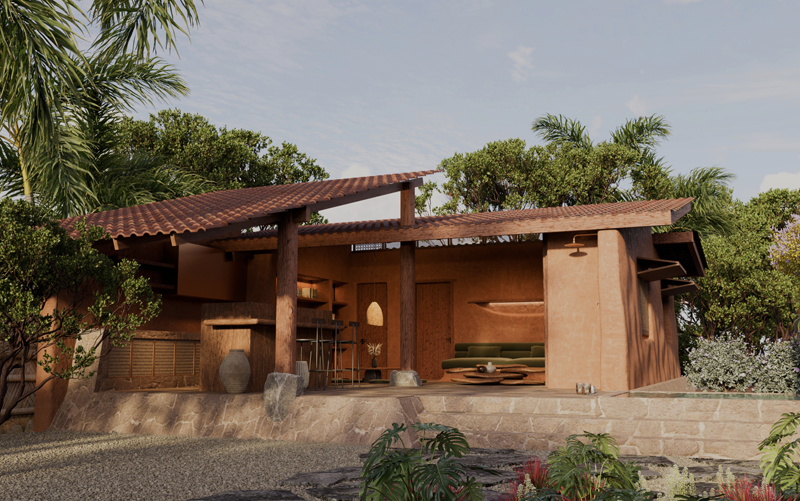 An environmentally friendly housing project, constructed with local materials such as earth, stone, clay, palm bone, palm, and wood. Available in one and two-bedroom configurations.